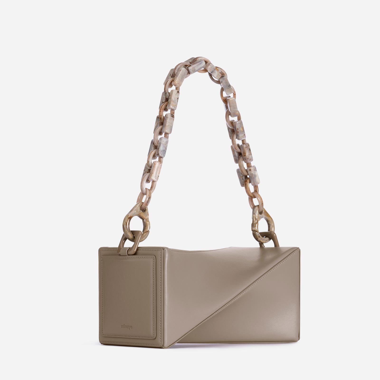The Stormi Bag takes utilitarianism seriously. featuring dual straps. The one-size leather strap is ideal for slinging over the shoulder snugly and a marble-effect acrylic chain serves as either a top handle or a shorter shoulder strap. Designed to carry only the essentials. and one card slot features on the rear side for easy card access.