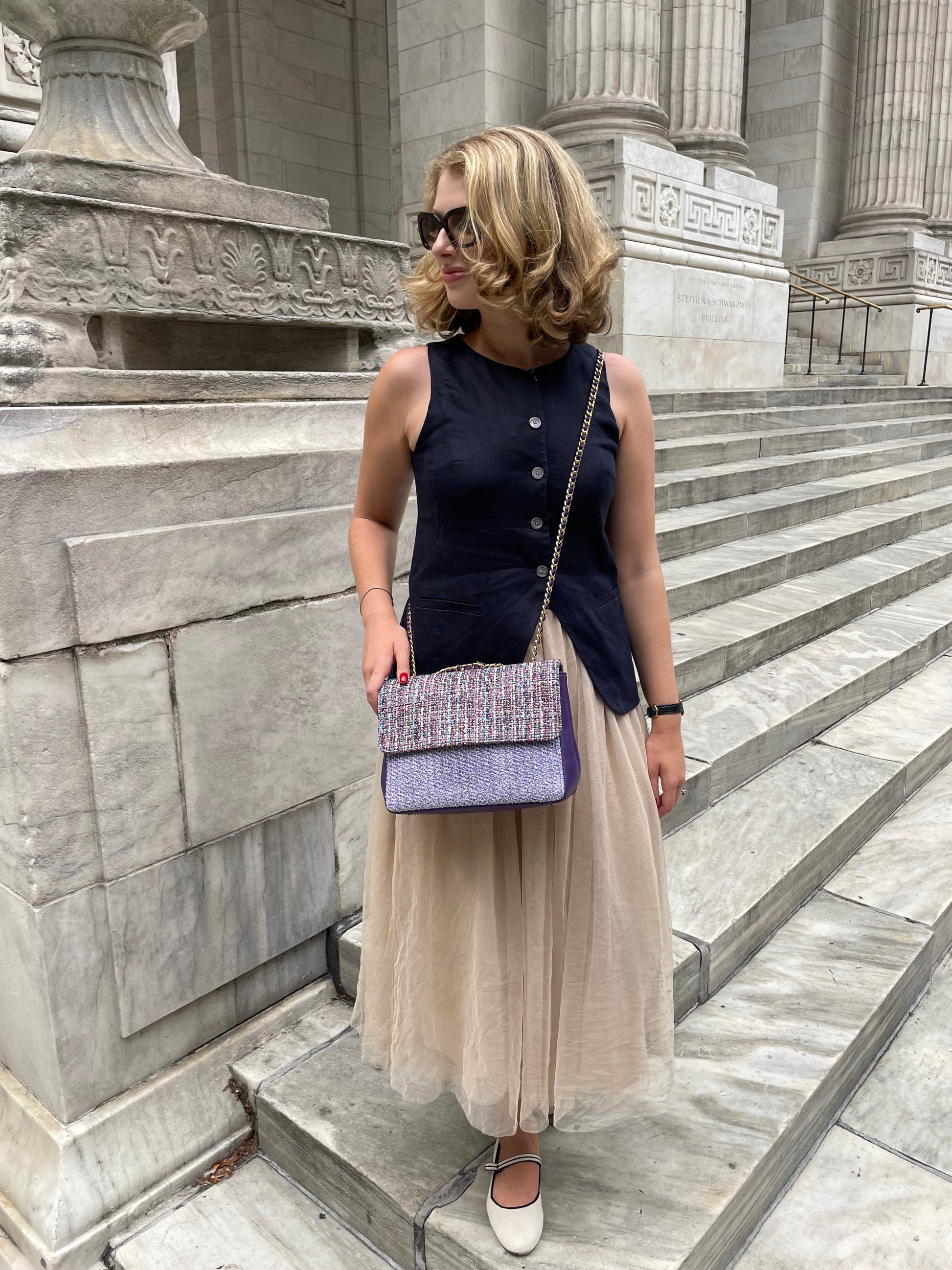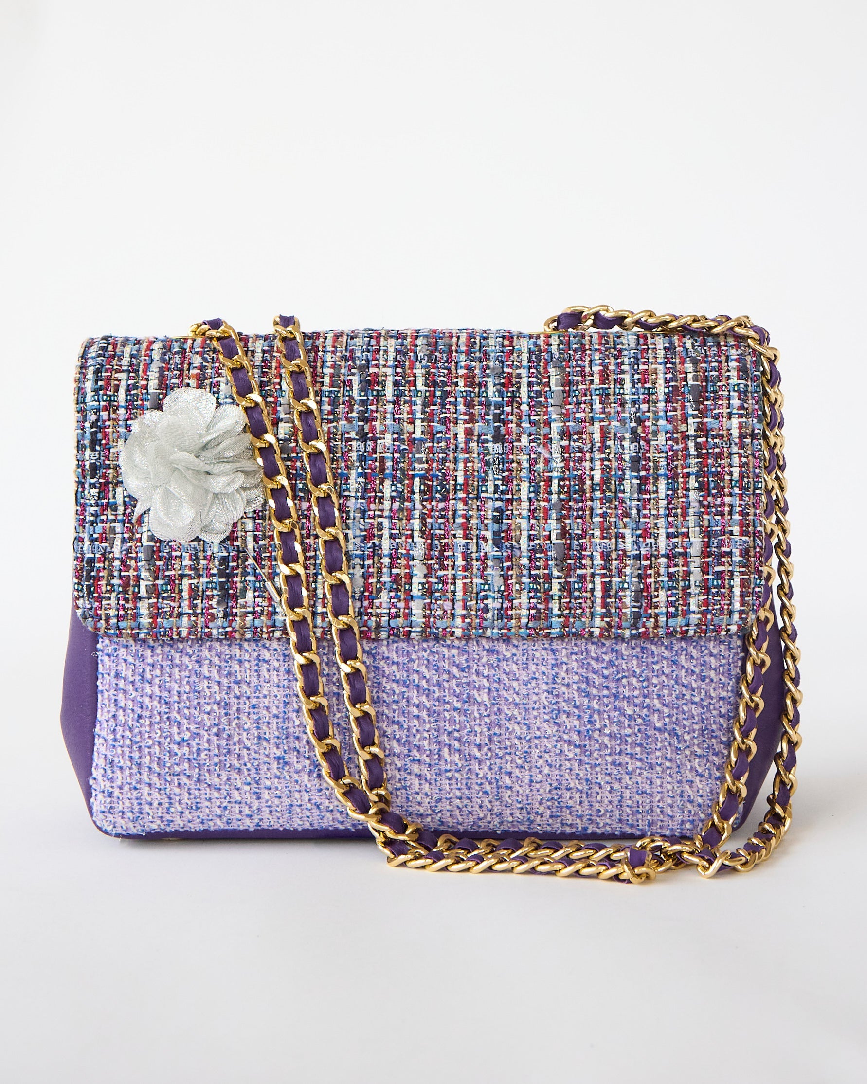 A made-from-scratch original. This bag is inspired by the bags we grew up admiring—simple. chic. but with something a little extra. Something that doesn't look like what just anyone has. The body of the bag is made with tweeds inspired by early Chanel shows. The gusset (that's the side) and bottom of the bag are made with leftovers from the leather atelier where we manufacture. And on the inside is a purple houndstooth print—a little pop of color just for you.